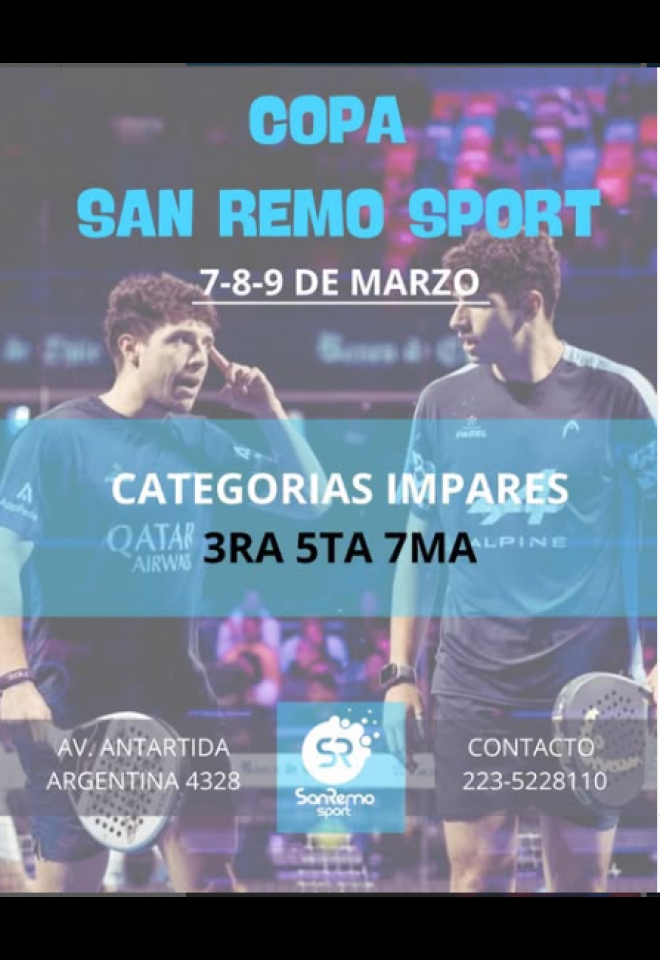 »» Evento: Etapa Marzo - Copa San Remo Sport Impares »» Localidad: Mar del Plata »» Fechas: 07/03/2025 al 09/03/2025