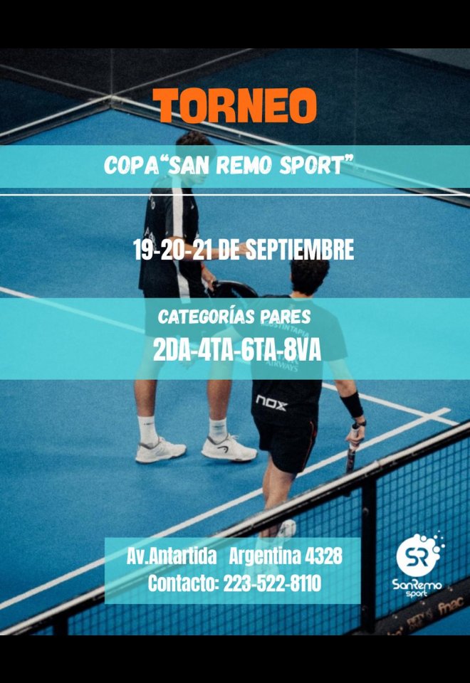 »» Evento: Torneo Copa San Remo Sports - Septiembre - Pares »» Localidad: Mar del Plata »» Fechas: 19/09/2025 al 21/09/2025