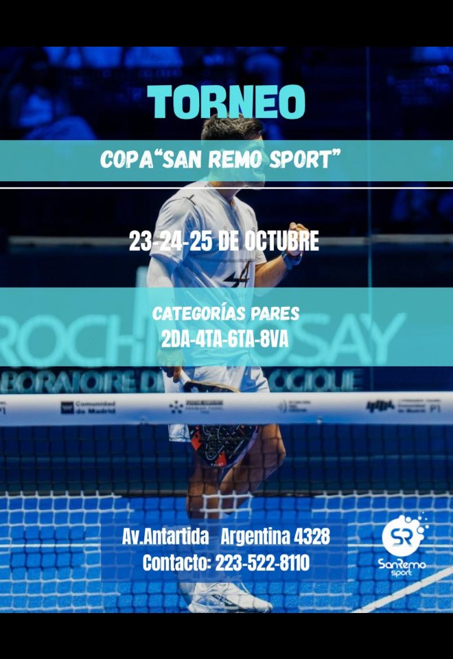 »» Evento: Torneo Copa San Remo Sports - Octubre - Impares »» Localidad: Mar del Plata »» Fechas: 10/10/2025 al 12/10/2025